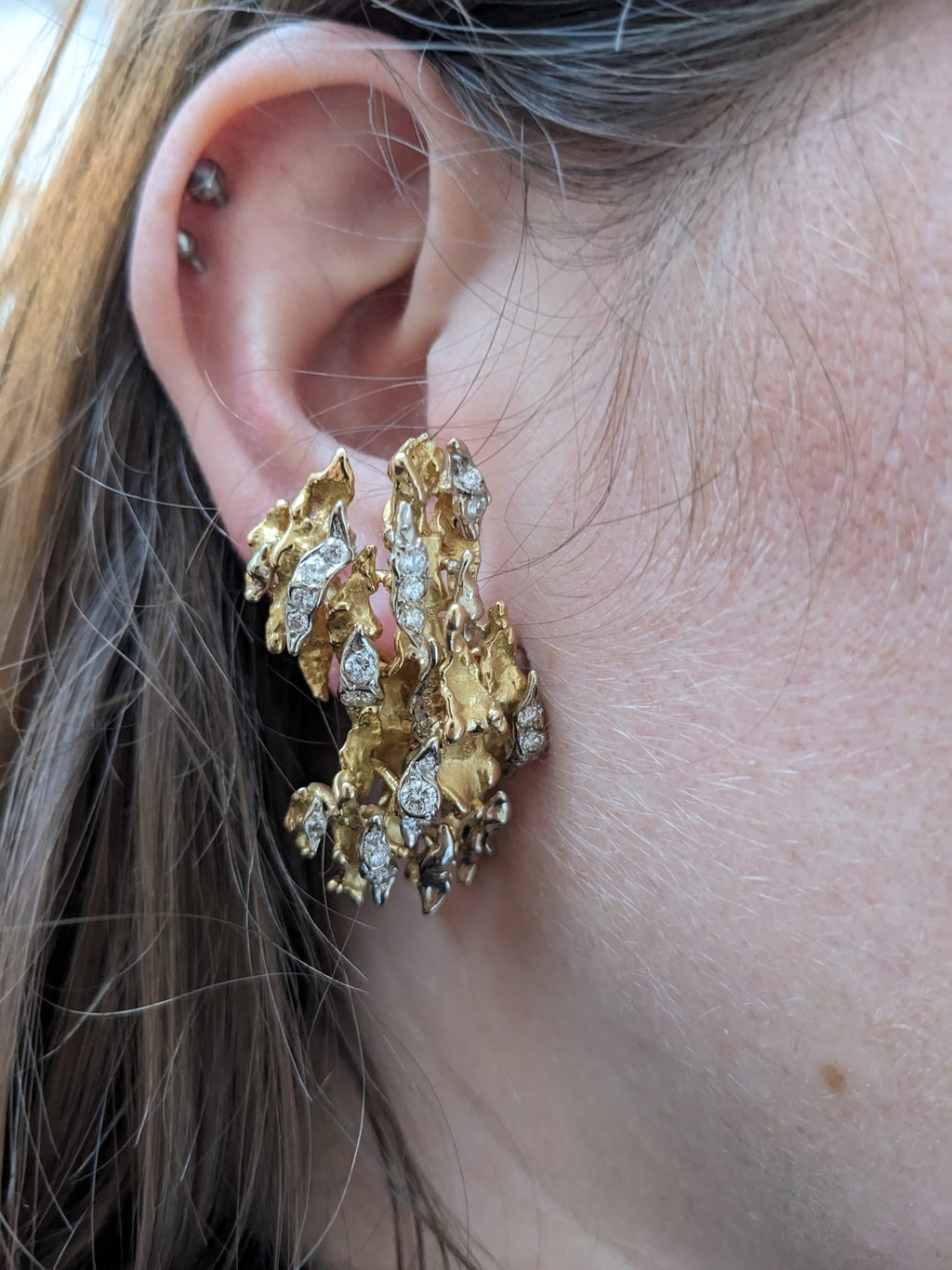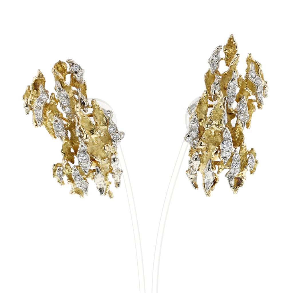 A pair of 1970s Sterlé Yellow and White Gold Earrings with Diamonds. The design has wavy patterns with brilliant cut diamonds set in white gold. Signed and numbered. The length is 2.04 inches and the width is 1.06 inches. The total weight is 40.55 grams. The total diamond weight is appx. 2.10 carats.