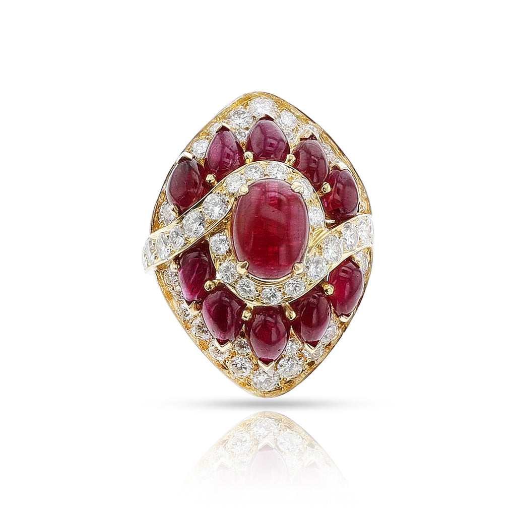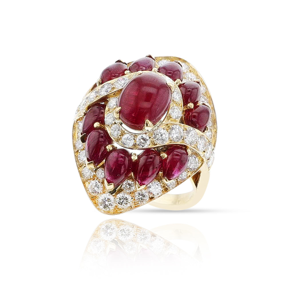 A BVLGARI Ruby and Diamond Cocktail Ring made in 18k yellow gold. The ring has oval and pear-shaped ruby cabochons with diamonds weighing appx. 1.80 carats (G–H color and VS clarity). The weight of the ring is 12.46 grams and the ring size is US 6.50.